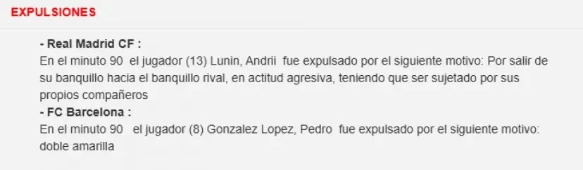 皇家马德里替补门将卢宁成为主要被处理者,他因与巴萨球员发生突破被平直红牌罚下。裁判在叙述中写说念:“卢宁因离开替补席并以挫折性魄力走向对方替补席,与巴萨球员对持,被队友强行拉开,随后被红牌罚下。”