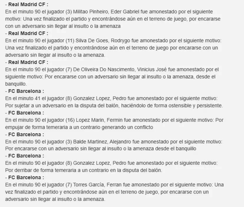 此外,佩德里在比赛经过中因两次犯规累计两黄被罚下。他的第一张黄牌是因拉拽维尼修斯体育集锦,第二张则是在第90分钟时对楚阿梅尼犯规作为过大而被出示。