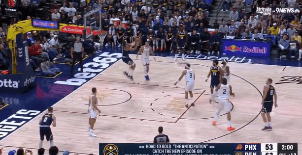 第二节比赛,约基奇弧顶高抛助攻,戈登腾飞360°回身空接暴扣。