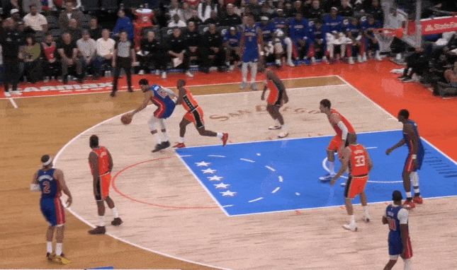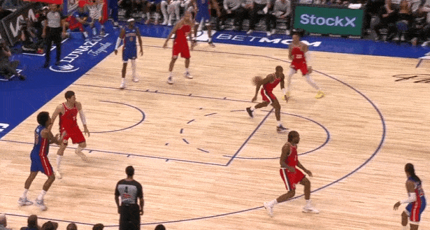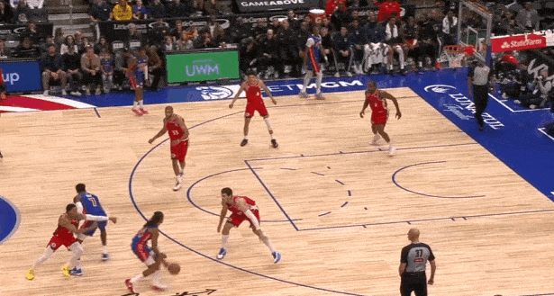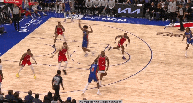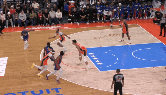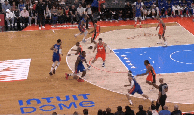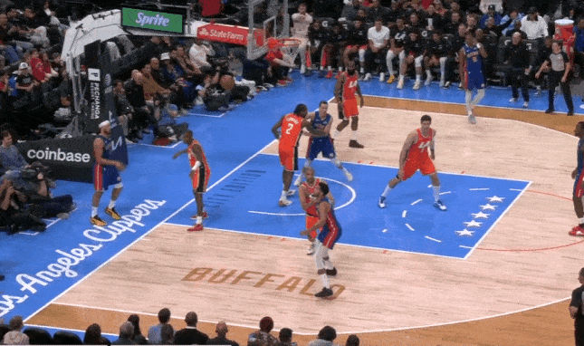 小卡行为弱侧底角的LowMan。斯图和勒维尔上线发动手递手互助,伦纳德随霍兰德上提并同期兼顾顺下斯图、弱侧外线霍兰德两东谈主。勒维尔破碎直杀篮下招引三东谈主留心后为斯图送出内传内,接球黄油手,地板球被伦纳德平直抢过。